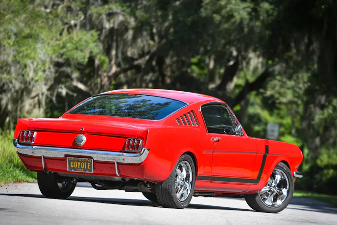 The 1965 Mustang fastback cruises on QA1 single adjustable coilovers with Global West frame connectors. A Rod & Custom Motorsports four-link was installed in the rear to help maintain traction. The Mustang has a built Ford 9-inch differential with 3.73 gears and a custom driveshaft to connect to the Coyote.