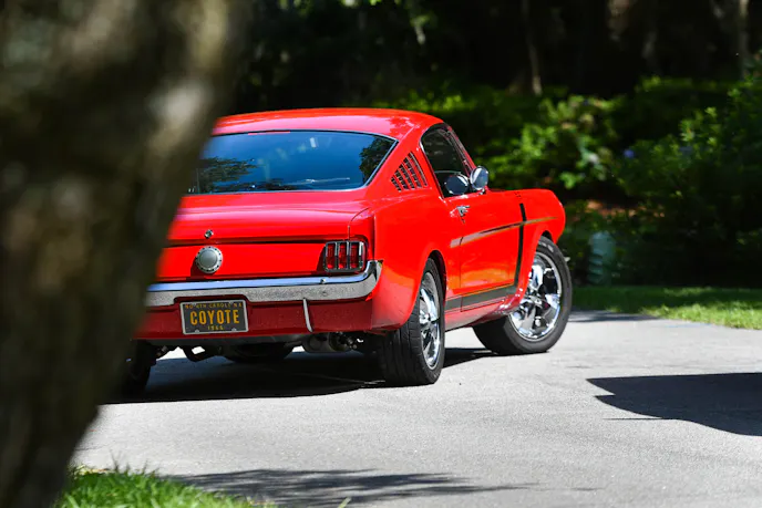 The 1965 Mustang fastback cruises on QA1 single adjustable coilovers with Global West frame connectors. A Rod & Custom Motorsports four-link was installed in the rear to help maintain traction. The Mustang has a built Ford 9-inch differential with 3.73 gears and a custom driveshaft to connect to the Coyote.