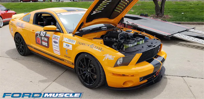 In the pursuit of more performance for this year’s competition, the Chicane 23 team sought to put it on a diet and add some power. The effort was successful, as the car lost 500 pounds and gained 157 horsepower, but not in the way you might expect. Instead of building up an aluminum-block 5.4- or 5.8-liter engine, Jonathan and company swapped in a VMP Performance TVS-supercharged Coyote 5.0-liter engine. That’s right, this is an SVT Shelby with the heart of a modern Mustang GT.