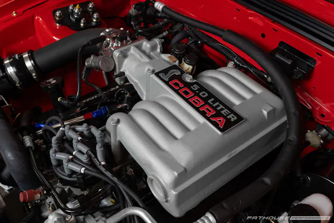 Behind that healthy 5.0-liter is a TREMEC TKX five-speed manual transmission fitted with a Hurst shifter, a RAM clutch, and a custom driveshaft that channels the output to a factory 8.8-inch rearend upgraded with ’04 Cobra rear brakes, Strange Engineering five-lug axles, and extended wheels studs.