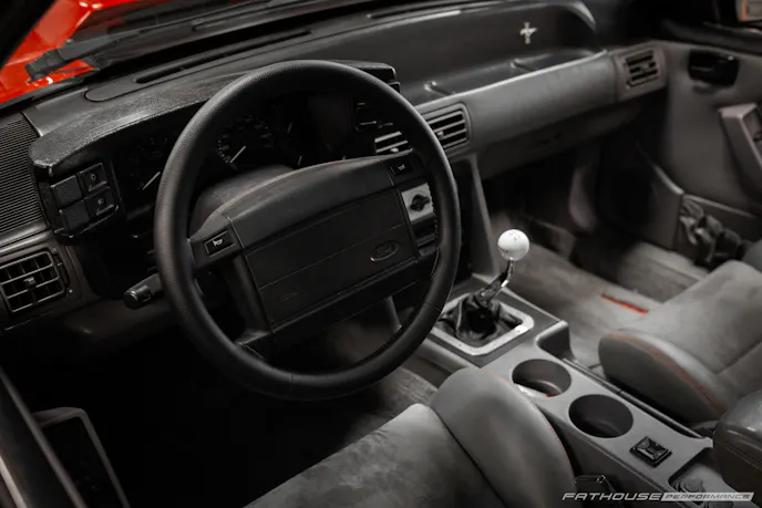 With all that modern horsepower in his presence, you might think that his affinity for the early ’90s pony cars had faded into the background. Quite to the contrary. That fire for a classic Fox still burned brightly, and eventually, Stoner scored his dream stallion — that elusive, Vibrant Red ’93 Cobra with an Opal Gray interior.