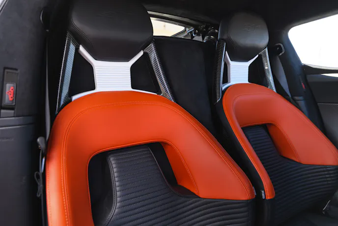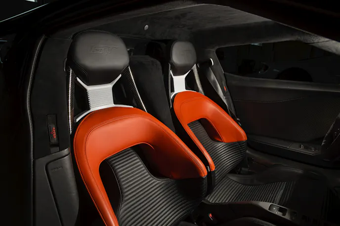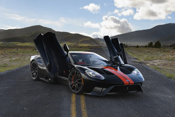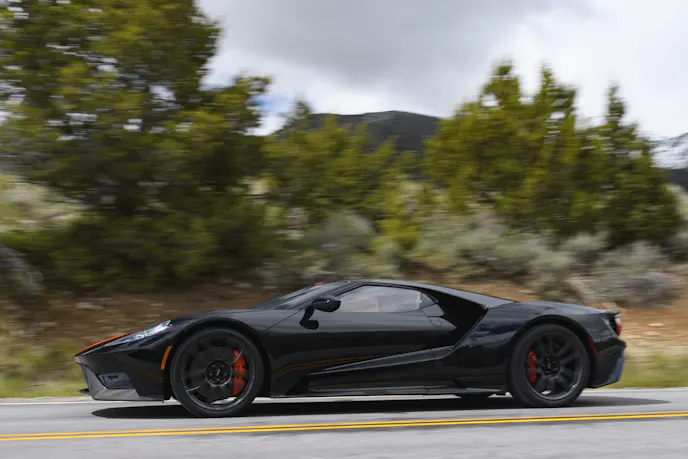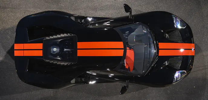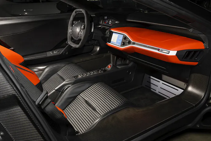 Essentially, the Ford GT is a street-legal race car built by the same group at Multimatic that created the Le Mans-winning racers, and powered by a refined version of the EcoBoost 3.5-liter V6 first deployed in the Daytona Prototype road racers. Backed by a seven-speed dual-clutch transmission, the twin-turbo six is fueled by a dual-fuel system — featuring both port and direct injection — and pumps out 647 horsepower and 550 lb-ft of torque. It resides in an aluminum rear subframe mounted to a carbon-fiber passenger cell fronted by an aluminum front subframe and wrapped in carbon fiber body panels. All told, it only weighs around 3,150 pounds.