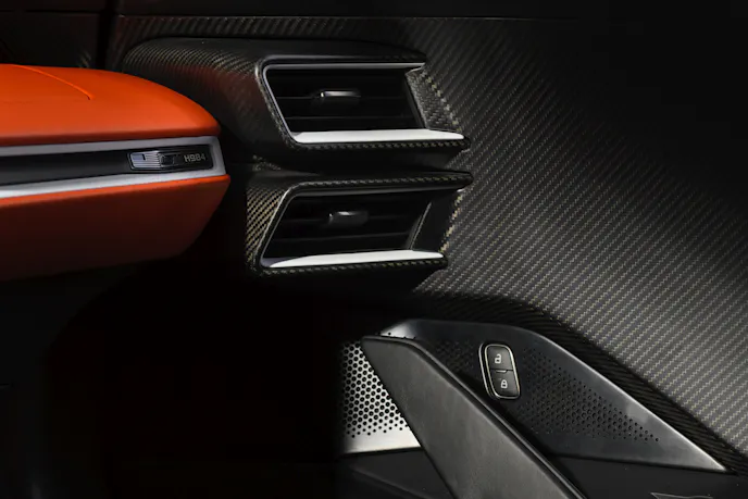 Before the party started, I spun the dial on the left of the steering wheel to change the drive mode from Normal to Sport to Track. Wet and V-max modes wouldn’t be necessary, and Track was just for fun. In Sport, the ground clearance remains at 120 millimeters, but the calibration sharpens. Switching it to Track, the supercar ratchets down to just 70mm above the earth’s surface, while the spring rates ramp up and the rear wing deploys to increase the downforce in less than two seconds. It was impractical for cruising the boulevard, so dialing back to Sport was the move.