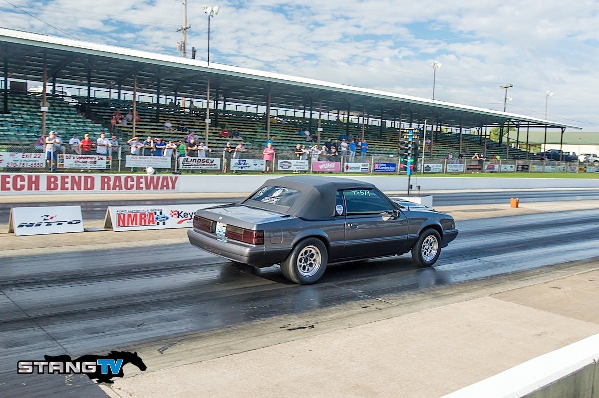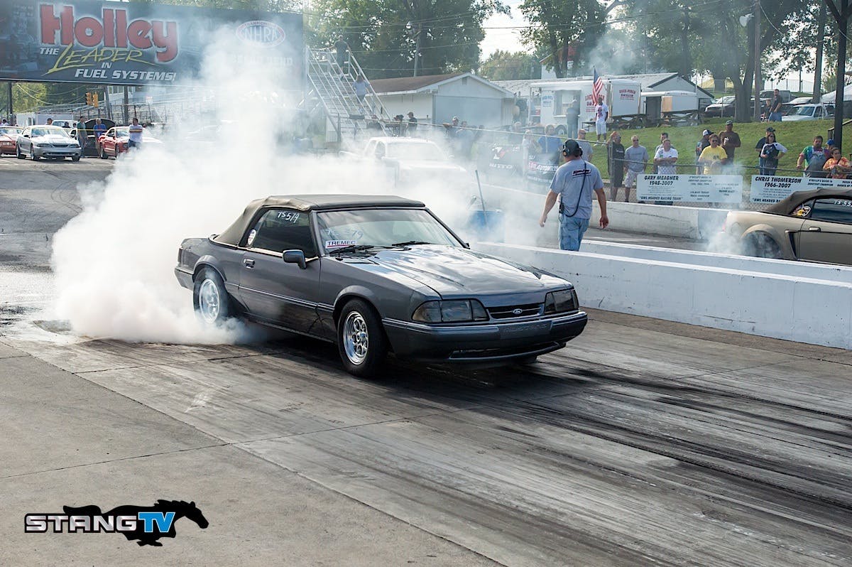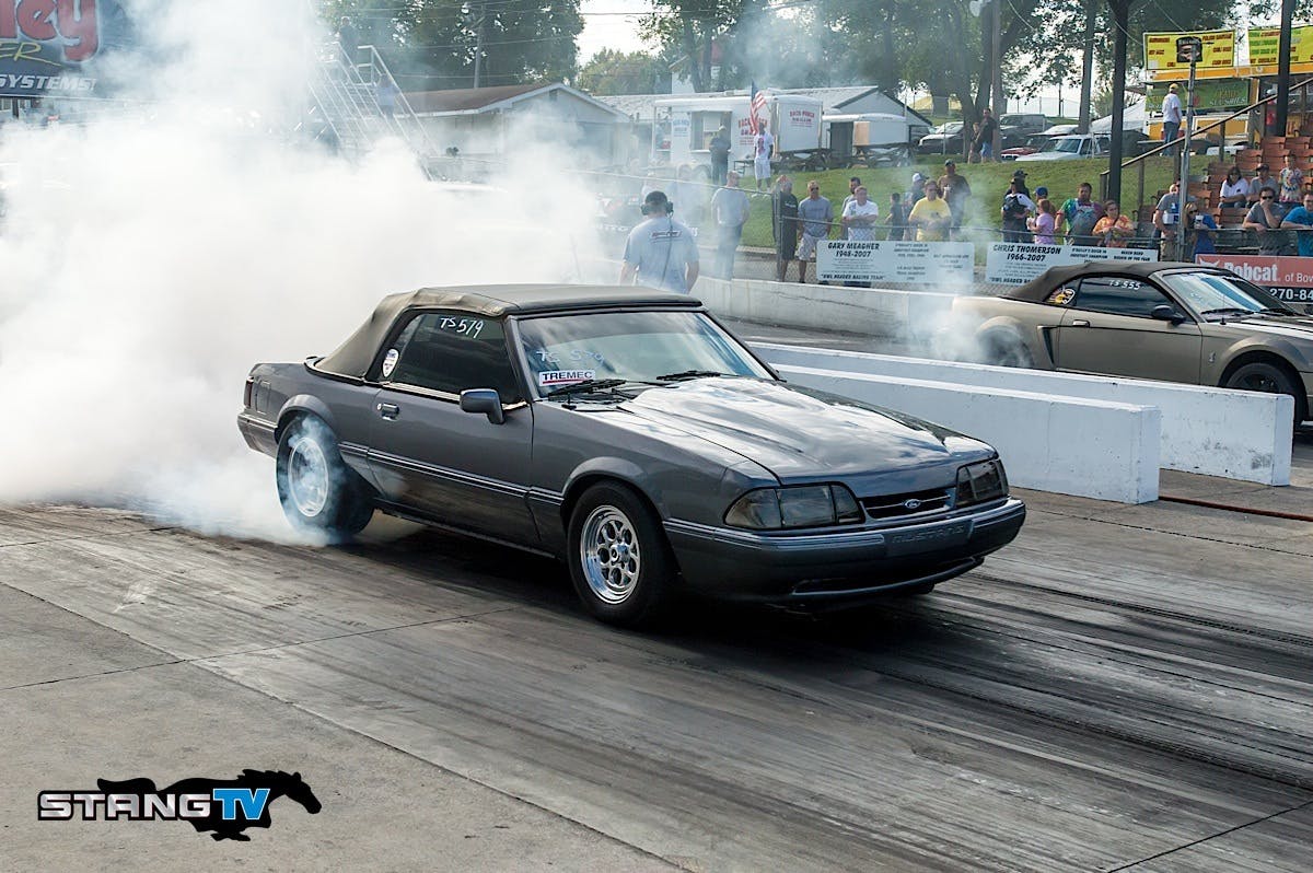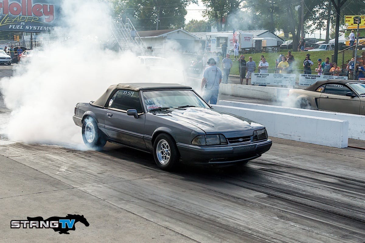 The exterior, once white, is now slathered with factory Dark Shadow Gray. Not only is the car powerful, but it is a beauty on the outside as well. Weld drag wheels also provide the perfect touch to the exterior of Jim and Joey’s Fox-body ‘vert.