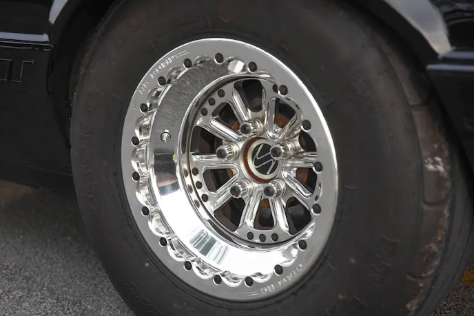 The transmission is a Ford Performance Tremec TKO 600 Extra-HD five-speed from American Muscle. The shifter is an all black billet unit from JEGS, topped with a Pennywise the Clown custom-made shifter knob from Nifty Shifters. The clutch is an Exedy Stage Two clutch. The Tremec transmission is held in place by a Stifflers crossmember. The rear axle housing is a stock 8.8-inch unit that was cut down 2-inches on each side. This allowed Terry Potter in Richmond, Kentucky to build the mini tubs. The clearance gave way to 10-inch Mickey Thompson ET Street Tires. The rearend was upgraded with Strange 35-spline axles with a full spool and upgraded wheel studs. The brakes were dialed in with PowerStop Evolution cross drilled and slotted rotors — these brakes help slow down the big speeds coming from the 600 horses under the hood.