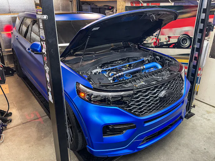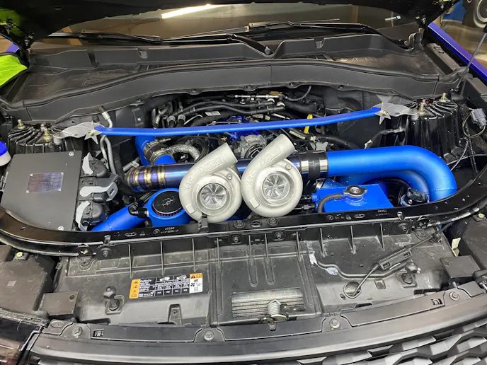 To match the performance aspect, the Explorer is being fully vinyl wrapped in a bright KPMF Matte Iced Blue Titanium. The engine is once again seeing a restructuring of its setup with a custom turbo kit, exhaust revisions, and intake manifold modifications. The updated turbos are being replaced by twin Xona Rotor 5451S turbos combined with Turbosmart wastegates and blow off valves. The exiting exhaust gas path is not the only thing to receive a revision, the throttle body and intake manifold are also getting the upgrade treatment.