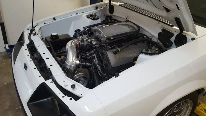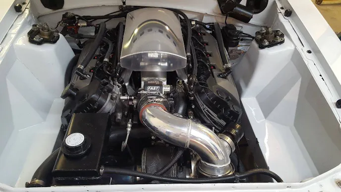 “I got the shell back, fitted the new Coyote engine, and slapped a turbo kit together for it,” Larry said.