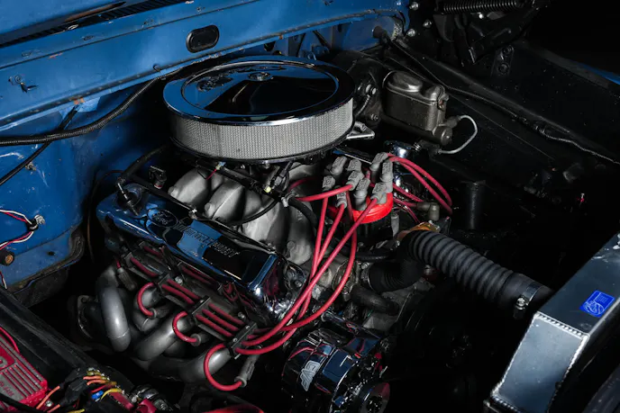 The first step in transforming New Blue was removing Ford’s long-standing twin I-beam suspension. In its place, QA1 installed a complete front-end setup designed for greater tunability, featuring their custom front suspension kit. This kit includes an engine cradle, crossmember, upper and lower control arms, and coilover shocks. To further enhance the build, a 1981 Camaro spindle setup was integrated into the front end, enabling a broad selection of readily available brake options.
