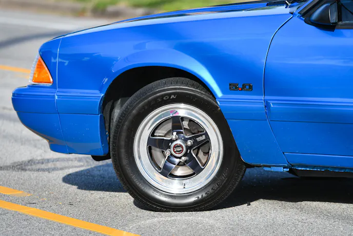 Moving to the interior, the base coupe model has now been fitted with a well-kept ’88 GT interior that includes the high-back tweed bucket seats up front. The gray tone of the all-stock interior components is the perfect contrast to the bright blue interior – likely why Ford offered the combination on the later-model, Bimini Blue-colored Mustangs. One particular item that Cleavenger singled out as one of his favorite parts of the car is working air conditioning—it would seem none of his more classic rides boast that, and a cool breeze is important when you live in the south!