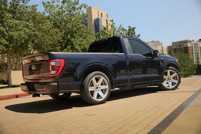 The F-150 shed its four-by-four ride height status by being lowered 3 inches in the front and 5 inches in the rear with a Viking Performance coilover kit from VAS. The suspension also includes Firestone air bag kits with an on-board air compressor. Rounding off the exterior are a set of 22-inch Giovanna Dramuno-6 wheels wrapped in Goodyear rubber.
