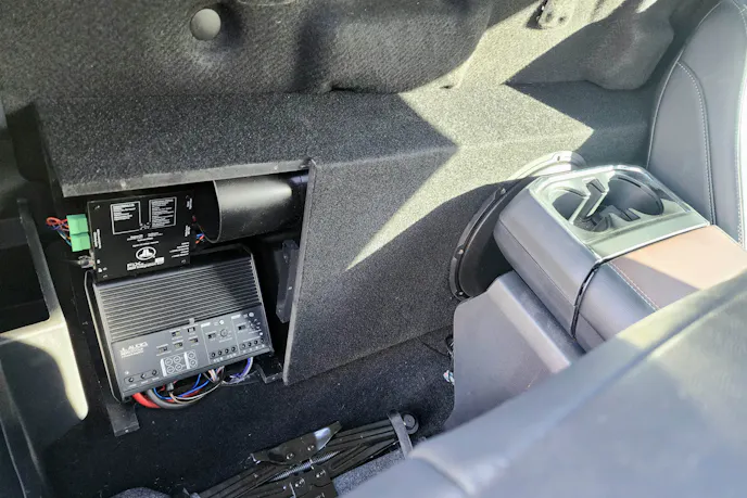The OE-plus interior didn’t stop there. Minor incorporated a 12-inch radio and a complete line of JL Audio into the mix. Minor and his passenger are greeted with the precision sounds of C7 Mids and highs, accompanied by a 12-inch subwoofer situated in a custom-designed and fabricated box that also serves as the host for the amp rack.