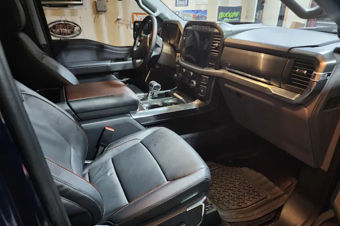 The Lariat theme continued into the interior with Lariat bucket seats, a center console, door panels, and A-pillars. The factory stalk shifter was relocated to the center console, as found on premium models, and a digital dash was installed.