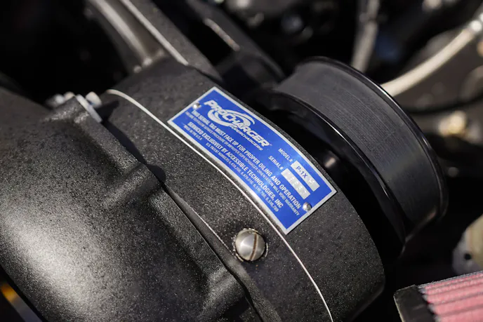 The ProCharged Coyote engine’s exhaust gasses escape through a complete exhaust system from SPD Performance Exhaust, which includes headers, equal-length trombone pipe, x-pipe, SPD mufflers, and J-pipe. This setup gives the exhaust note a deep rumble and a viscous growl upon acceleration. Connecting the factory systems with the newfound power was facilitated with the assistance of HP Tuners.