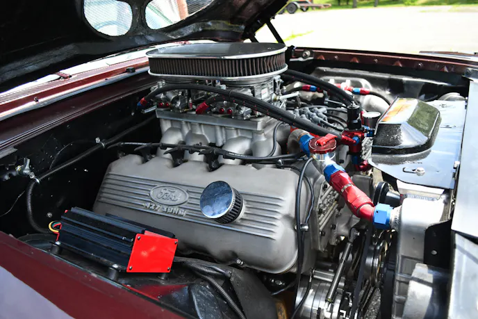 On top, you’ll find a Dove high-rise, cast-aluminum intake manifold that was massaged by John Marcella and is fed by a pair of Quick Fuel Technology 850 cfm carburetors. On the exhaust side of things, a custom set of stainless steel headers were fabricated for the Galaxie, as was a 3-inch, stainless-steel exhaust system.