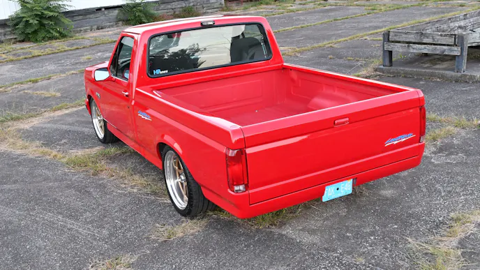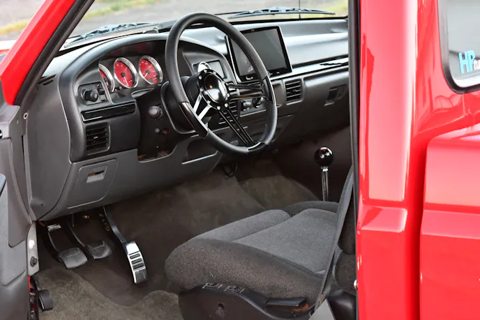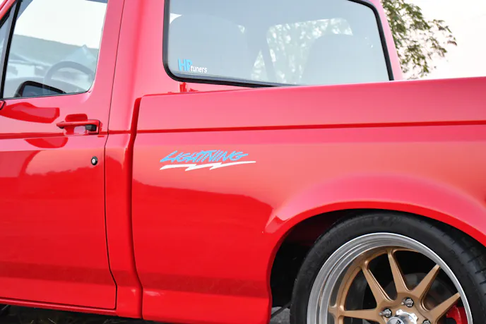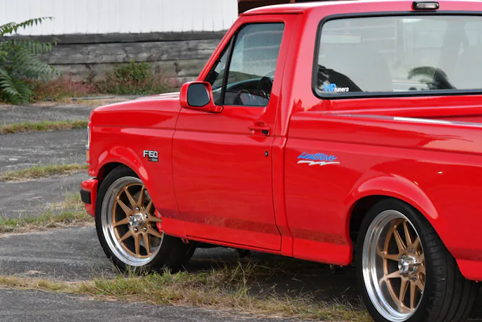 Speaking of bounce, part of the reason why this Lightning stands apart from others is its custom wheels from 3030 Autosport. Newman chose the fitment specifications and had 3030 Autosport manufacture a set of its GO5Y wheels in 20×9-inch front and 20×10-inch rear sizes. He then found a deal on some Porsche Cayenne takeoff Michelin Pilot Super Sport tires, sized P255/40/20 at the front and P295/35/20 at the back. Tucked behind the big hoops are Wilwood 6-piston calipers and 14-inch rotors. Newman utilized a Little Shop Manufacturing kit that allows them to bolt onto the factory spindle and a Bronco Graveyard kit that swaps out the drum brakes for a disc setup.