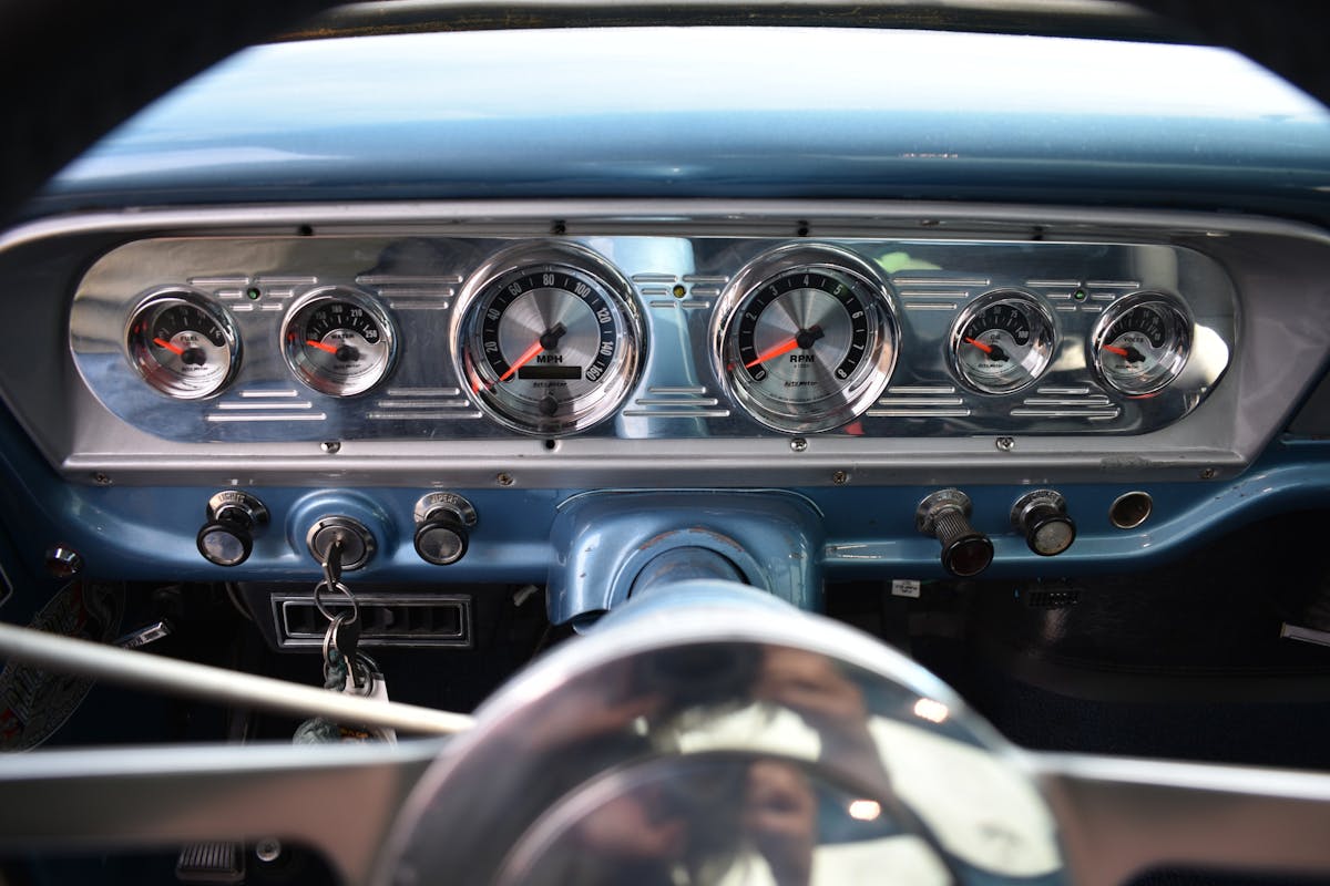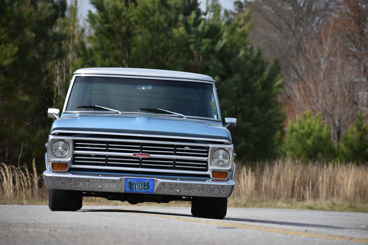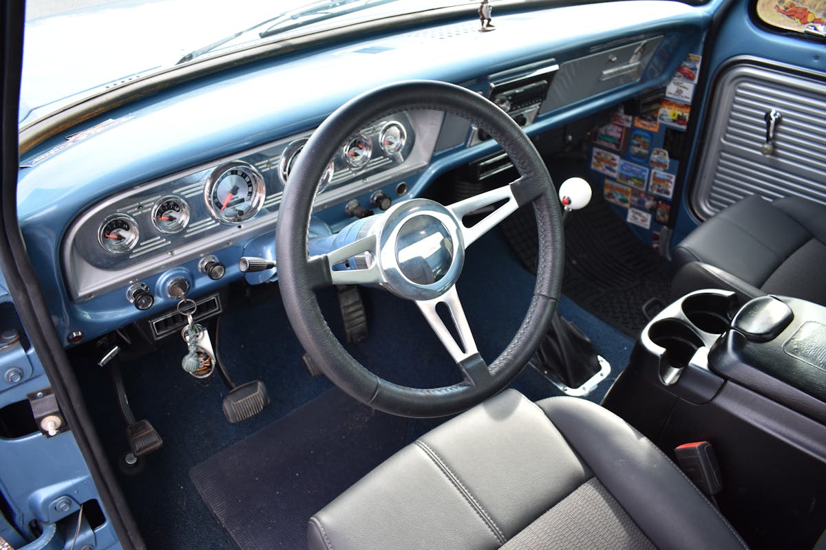 Now that the suspension was handled, Peppers could focus on what he does best: paint. A fresh coat of Brittney Blue paint was sprayed on the cab and body. To prevent any oversaturation of color, Peppers offset it with a shade of off-white that would coat the cab’s roof, embossed Ford tailgate, and trim pieces. On the inside of the cab, Peppers installed an aftermarket steering wheel and a Boese cluster with American Muscle Auto Meter gauges as well as a painted dash.