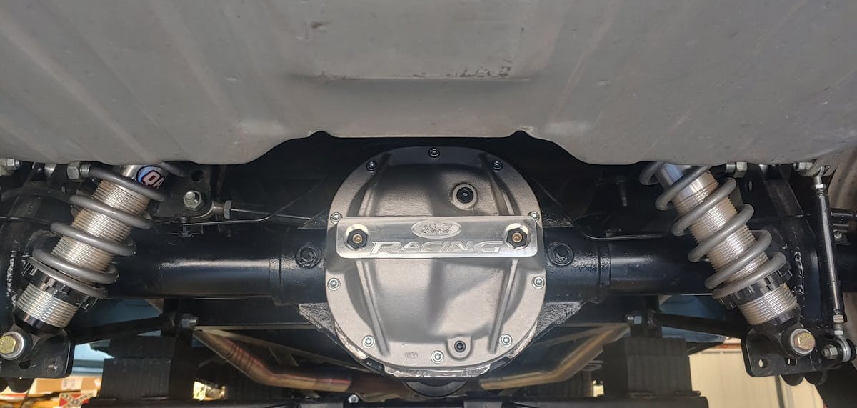 Peppers wanted full control of the chassis from handling to shifting, so a Hanlon Motorsports-built TREMEC TKO-600 was ordered. The TKO-600 was known to handle abuse, but after Hanlon was finished, the transmission was near bulletproof. A Competition Clutch twin-disc clutch was installed to transfer power from the future engine to the transmission before entering the Ford Explorer 8.8 rearend. A Ford Performance rear differential cover was installed to prevent any fluids from escaping, as the engine of choice was sure to twist the rear. A pair of Yukon axles with c-clip eliminators were installed and would be the final point before the power made its way to the 295 series tires.