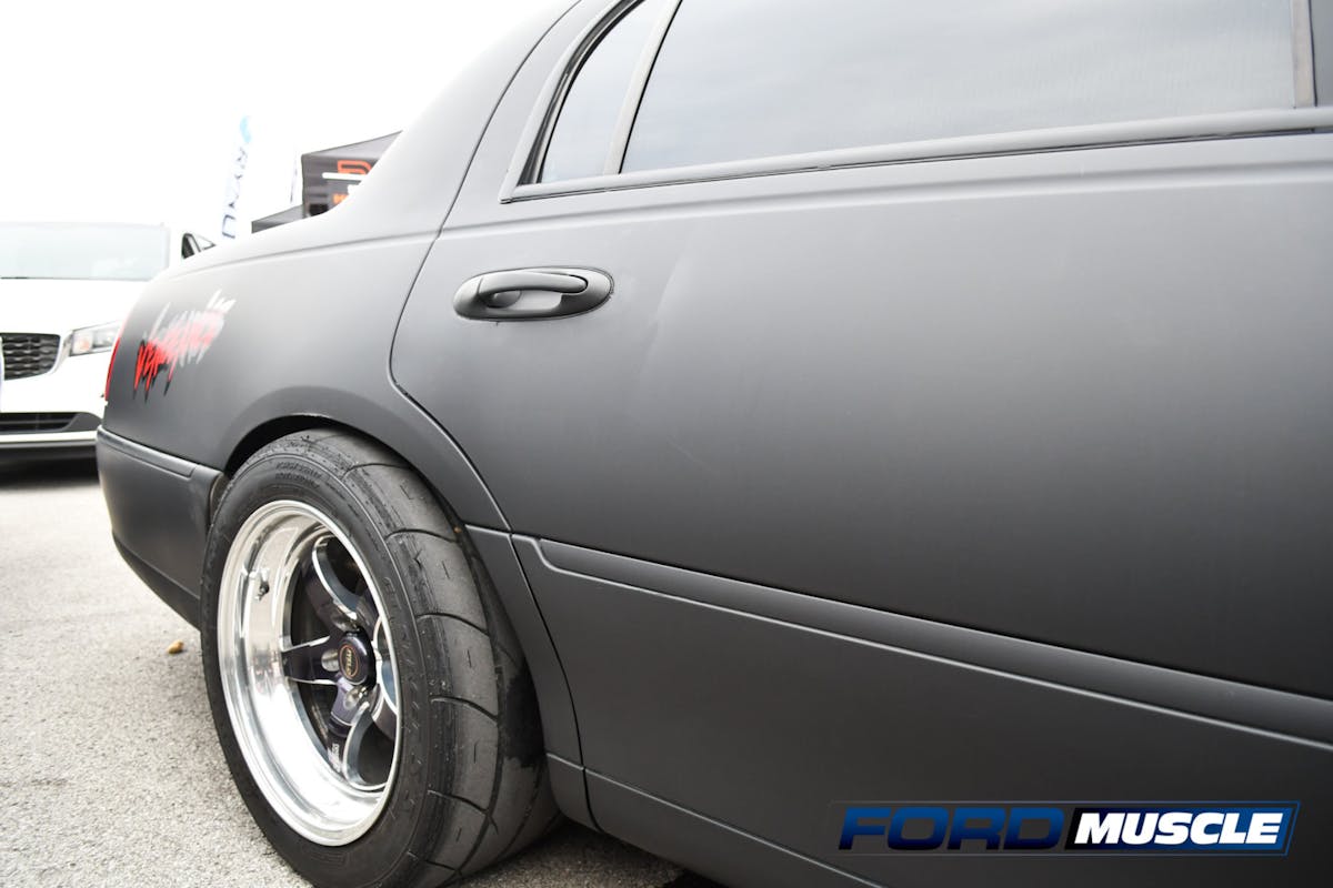 After performance was handled, Jewell wanted the Lincoln’s exterior to match the aggressiveness of Ford’s high performance Coyote engine. A murdered-out theme was chosen and a cloak of matte black covered the exterior. The Coyote engines’ output far surpasses the Modular 4.6, so a set of Weld RTS wheels were chosen to handle the newfound performance. Nitto 555’s in the front keep the car steering where requested, and a pair of Mickey Thompson ET Street S/S tires do their best to keep the rear wheels planted to the pavement.