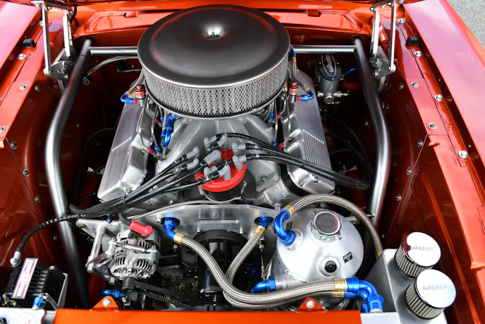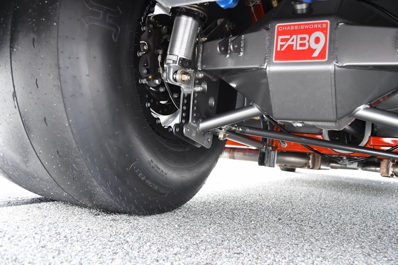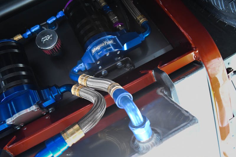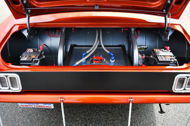 The engine is fueled by a MagnaFuel fuel pump feeding into a Holley 850 carburetor. A custom aluminum fuel tank stores the fuel for both the engine and the progressive Nitrous Oxide Systems setup, with 400 horsepower of nitrous available. With the new engine installed, the plumbing handled by Brown and Miller Racing Solutions, and electrical wiring overseen by Rick Elgin at Racewire Technologies, it was time to circle back to the original plan of installing a new set of headers. Pettigrew once again prepped the welder and crafted a set of 3.5-inch oval exhaust tubes with custom SpinTech mufflers.