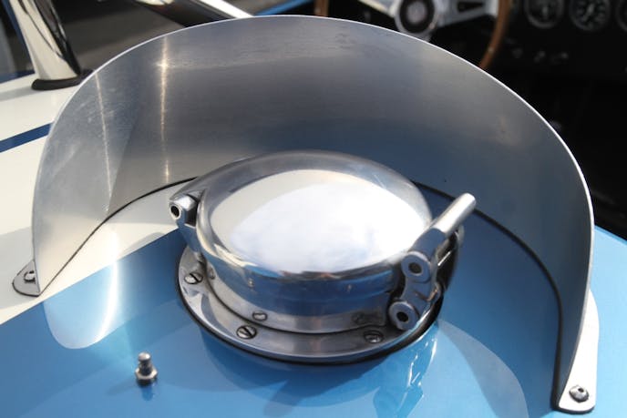 The Shelby FIA Cobra is available with-or-without the "suitcase" dents. We prefer to have them for authenticity-sake. Meanwhile, this shield kept the wind from opening up the gas cap.