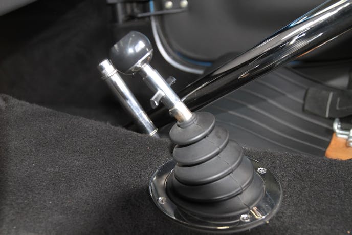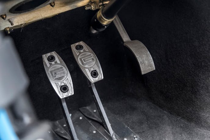 • Stainless steel roll bar, chassis-mountedThere was a call also for wider tires — to go with a rule mandating that tires must be enclosed within the fenders of the car. This makes for a visual treat, as the front fender flares more closely match the rears, giving the car a muscular looking stance. The other could quirk would be the “cheater” windscreen — designed to tilt back slightly under speed, cutting further wind resistance on long straightaways. Naturally, a roll hoop had to be fitted to the car for racing as well – and includes a diagonal brace, which on the original car, would be removed by Sir John Whitmore in the 1965 season.