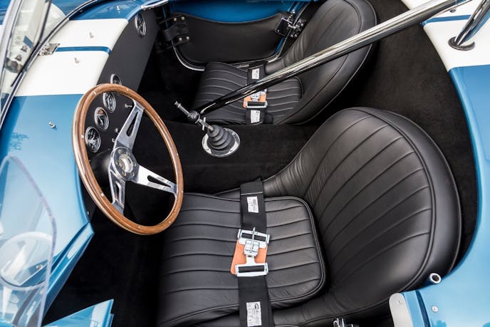 Getting into the FIA Cobra, after the walk around, reveals a tight but comfortable, glove-like fit with an adjustment of the seat. The Mota-Lita wood steering wheel, aluminum interior with leather seats and vinyl dash get the mind reeling to a simpler time where this purpose-built racing beast was just about speed and cornering. There are only latch-hook lap belts.