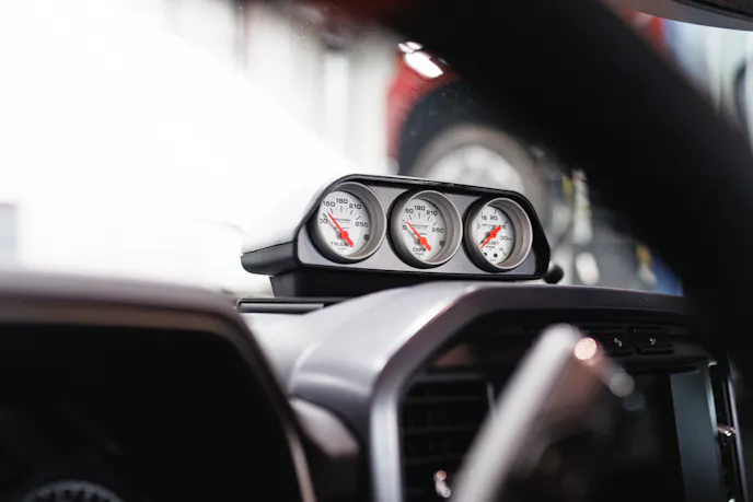 The interior maintains much of the F-150’s factory identity, though it will soon receive Recaro Podium carbon-fiber seats and Teamtech seven-point harnesses to keep occupants secure. A Flaming River master battery disconnect adds safety, while Auto Meter gauges provide real-time feedback on key vitals, including transmission temperature, axle temperature, and boost.