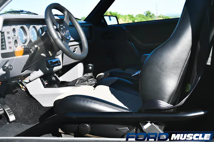 With that in mind, he selected a Ford Performance Gen 2 Coyote crate engine breathing through a ported 2018 Mustang GT intake and a JLT cold air. It’s fed by an Aeromotive A1000 fuel pump inside a Stealth tank under the sway of an Aeromotive billet fuel pump speed controller. With its Ford Performance Control Pack PCM via HP Tuners hardware and software by Pro Dyno in Ft. Mill, South Carolina, it puts down 425 horsepower and 383 lb-ft of torque.