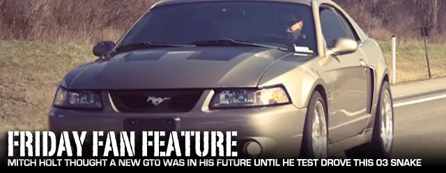 Explaining that there might be something on the used car lot that was more in his price range, Holt was taken to see a Mineral Gray 2003 Cobra that was recently traded for a bow-tie pickup. Only knowing that the Cobra package offered better performance than the standard GT, Holt signed up for a test drive. Immediately enamored with the car, paperwork was signed, and Holt took the car home with him the same day, a scant 21,000 miles on the odometer.
