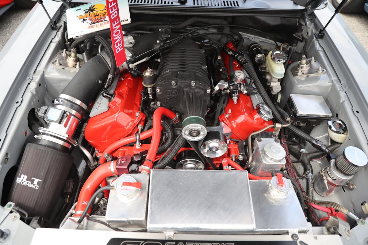 That sound and performance travel in a handsome boosted Mach 1 that combines some of the most fetching features of the area that are topped with a sleek, gray finish. That complete package grabbed our attention during the Mustang Week 2024 car show and earned a spot in the coveted Ford Muscle Great 8, a single-eliminator contest voted for on the Ford Muscle Facebook page (every Friday until it wraps). So watch for stories on the other Great 8 contestants, and be sure to vote for your favorites.