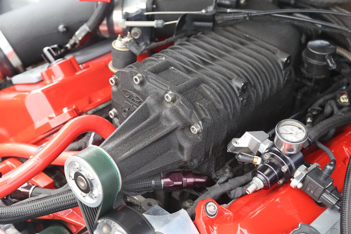 Under its Shaker hood is a Four-Valve 4.6-liter engine that rumbles to the tune of COMP Cams bumpsticks spinning courtesy of MMR timing chains. The deep-breathing modular inhales through a JLT Cold Air Intake, an SCT Big Air mass airflow sensor, and a 100mm Accufab Throttle body. This high-flow air path feeds a ported and polished Eaton Roots supercharger wearing a 2.76-inch Billetflow pulley that generates ample boost.