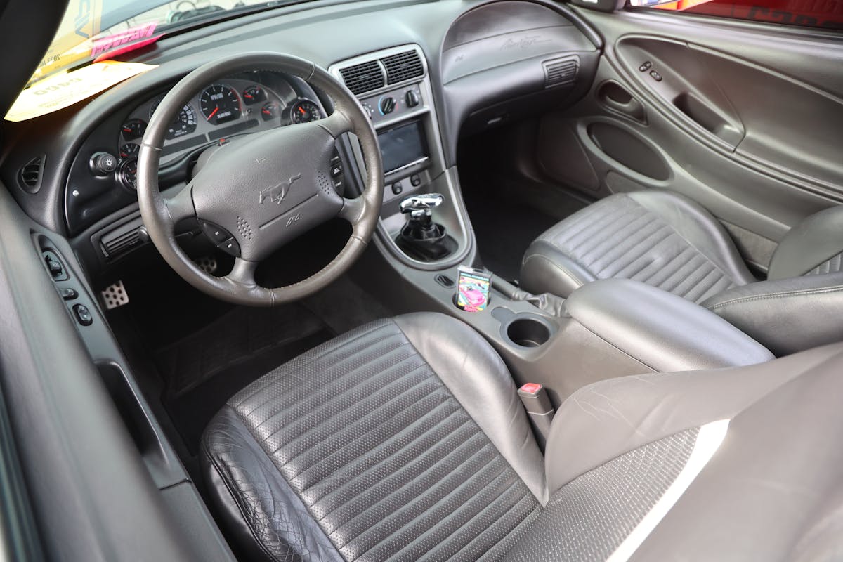 With a love for cars from that era, Stephen channeled his passion into revamping this Mach 1, which had suffered extensive front-end damage on that ill-fated ride in the rain. He fully disassembled the car and remade the front end in the image of the New Edge with a ’03-’04 Cobra front bumper with functional brake air ducts and a new hood fitted with a Shaker-style scoop. The whole package is sprayed with the aforementioned Audi hue and ceramic coated for protection.