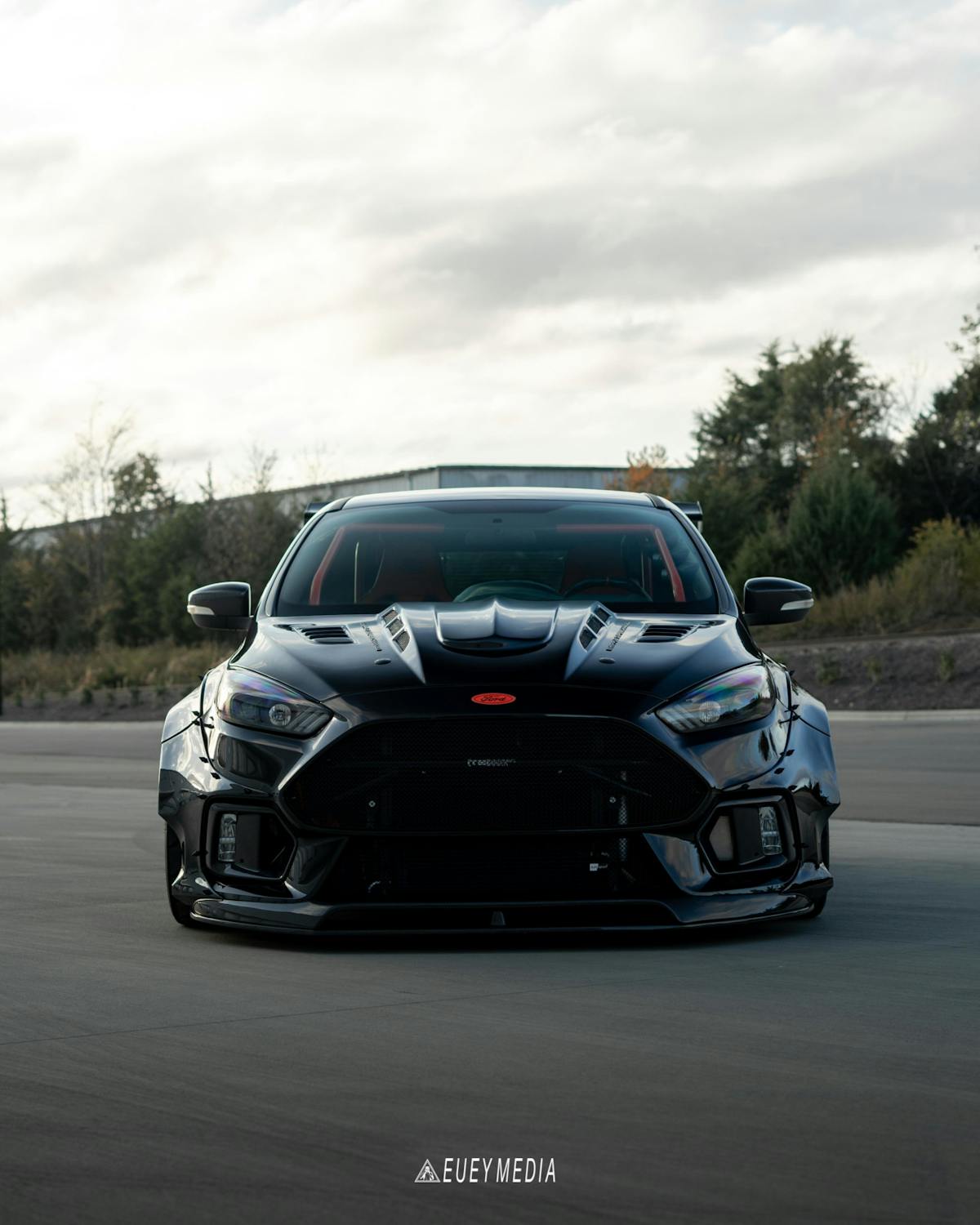 Jeremy also chose to equip the Focus with a Fortune Flares widebody kit for an additional 60mm of width. Anderson Composites was the go-to spot for carbon fiber components including doors, side skirts, rear hatch, and front valance. A Battle Aero rear wing is perched upon the new rear hatch. A fiberglass cowl hood was chosen to cover the Coyote, and a TB Performance front crash bar was also installed, along with Spyder headlights and taillights.