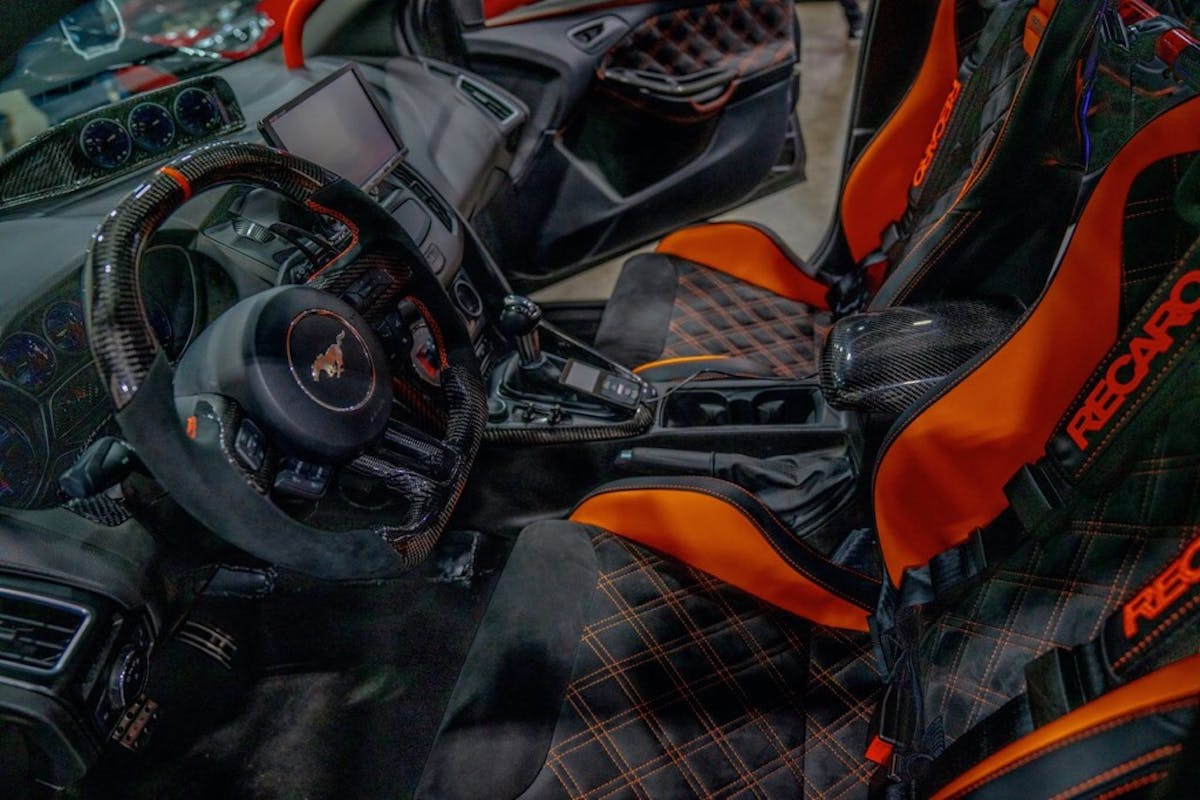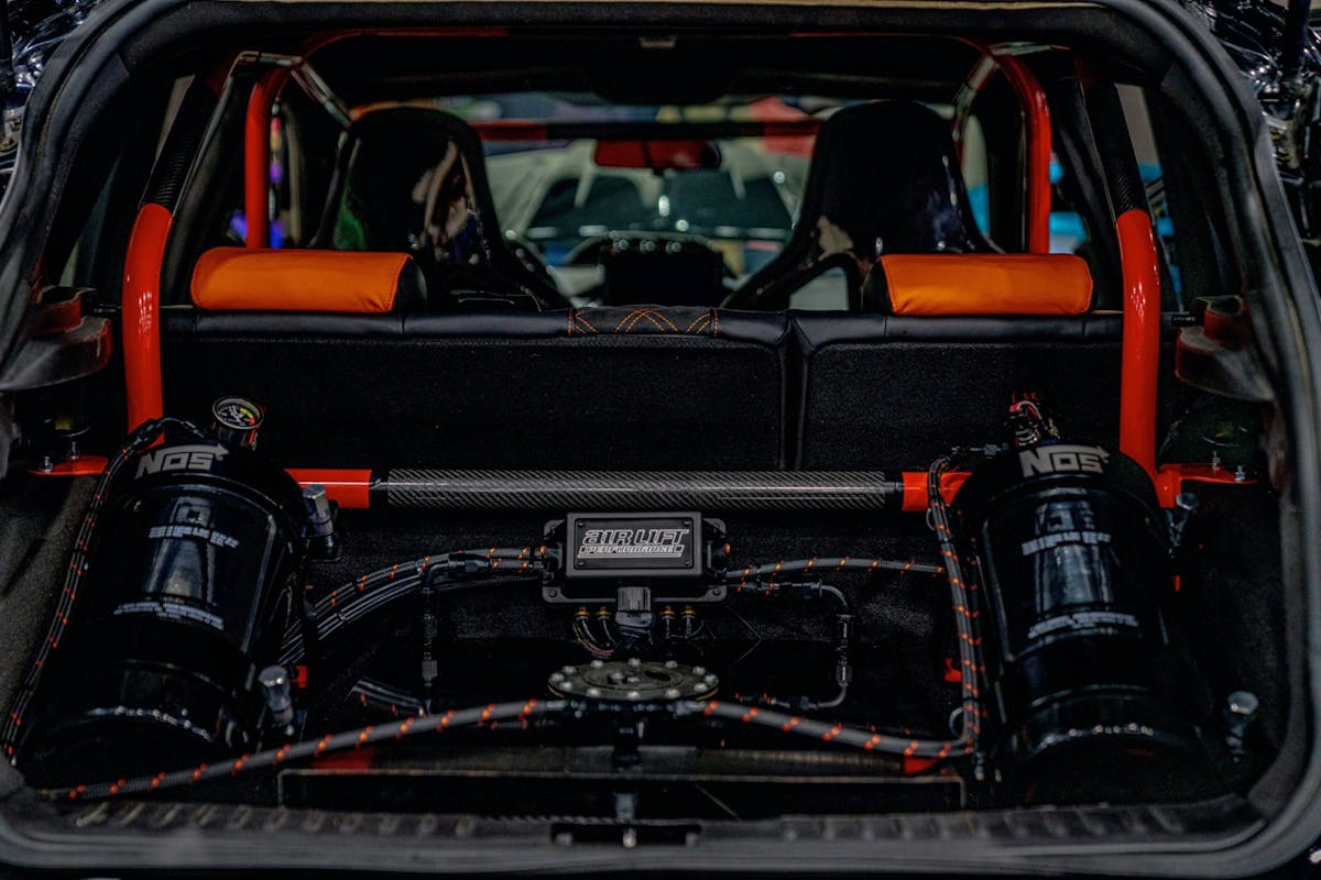 The wild black and orange exterior color scheme flows into the interior, with AMX Performance custom door panels and AMX-upholstered carbon fiber Recaro seating. The sharp carbon fiber interior continues with the steering wheel and interior accents. Jeremy custom designed and installed a rollcage before his brother sprayed it with a coat of orange paint.