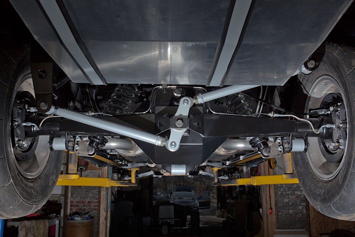 The front suspension consists of custom tubular A-arms allow the steering rack to be lowered. The QA1 Proma-Star adjustable coilovers are mounted to custom, welded gusseted plates that replace the factory locations. "This design ensures that the weight of the front suspension is distributed in the same way as it was designed at the factory with the load being transferred to the cowl through the custom tubular shock tower brace instead of the load being entirely placed upon the thin stamped steel framerails as is common in other kits," Lance told us. "The tubular torque arm is complemented with double adjustable lower control arms. The lateral stability is handled with a custom Watt's Link setup, and a custom rear swaybar is tucked inside the rear framerails.