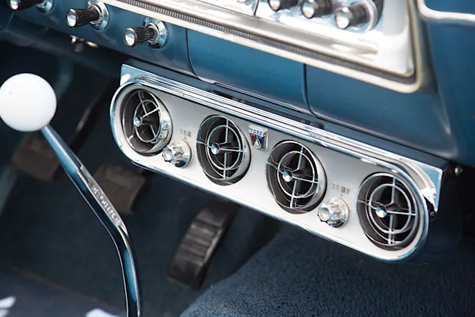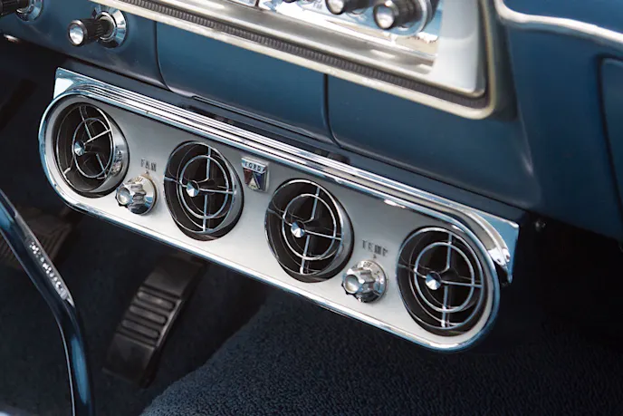 Lance was able to use the stock air conditioning compressor on the Coyote and link it up to a Vintage Air Magnum unit. However, he wasn’t a fan of the off-the-shelf A/C vents, as he believe they didn’t really jibe with the stock look, so Lance found a vintage Ford air conditioning vent unit and Chuck built a manifold to mate it with the Vintage Air unit.