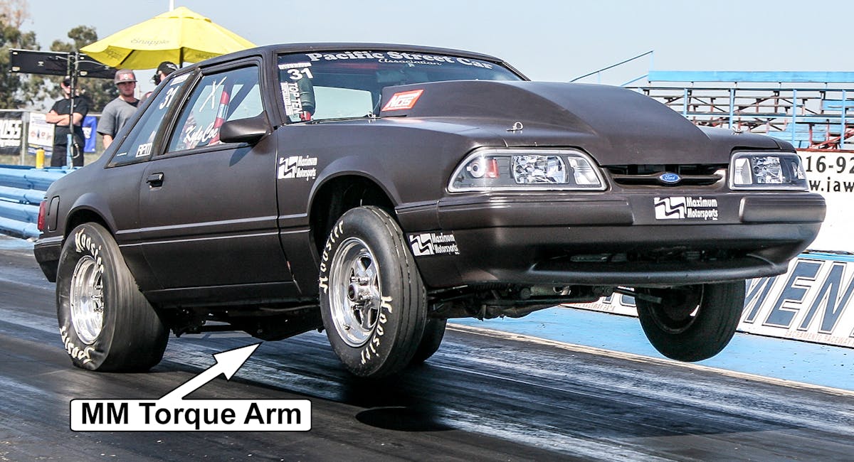 These two photos show the difference in appearance of a Mustang with two different rear suspension setups. The “before” shows the car with a 4-link set up for drag racing. The “after” shows the same car in the same corner with the same driver, but with a torque-arm rear suspension.