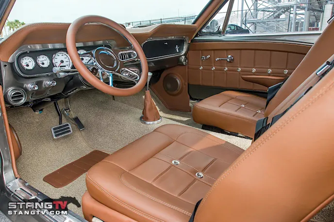 Inside, a gorgeous Bourbon interior installed by Joe and Eddie Sanchez of Deluxe Interiors in San Dimas, California, really pushes the Mustang’s appearance to the next level. “The interior is wrapped in leather throughout,” Glen says. “We cut the tops off of the LeMans power seat to give it the look of a low back seat. The passenger seat tips forwards and reclines back, and we reshaped the seats and custom door panels to continue the design of the engine compartment inside to the interior.”