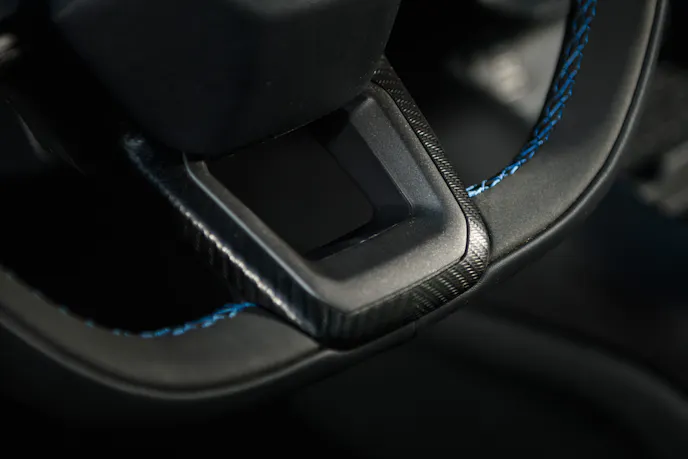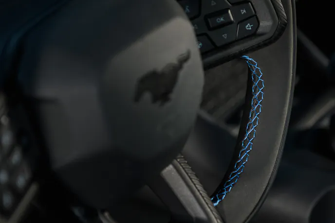 While it resists tram-lining, the Dark Horse did show a bit of bump steer when confronted with major road surface changes, but in general, it carries the same steady precision offered by its lower-powered cousins, albeit with a bit lighter feel in the flat-bottom wheel than the Mustang GT Performance Pack.
