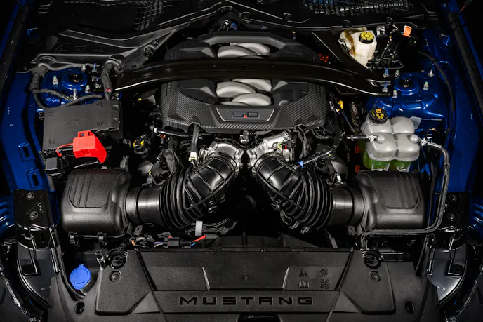 Fed with the familiar dual-fuel arrangement that plays on the strengths of both port and fuel injection, the latest Coyote wears upgraded heads and camshafts. It also benefits from a new steel oil pan with a lower volume that delivers reduced windage and improved efficiency. In total, it cranks out 480 horsepower and 415 lb-ft of torque. Adding the Active Valve Performance Exhaust elevates the output by 6 horsepower and 3 lb-ft of torque thanks to reduced restriction.