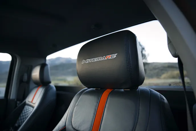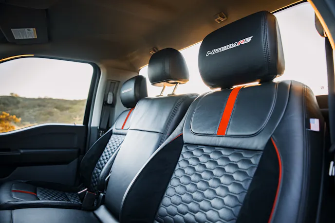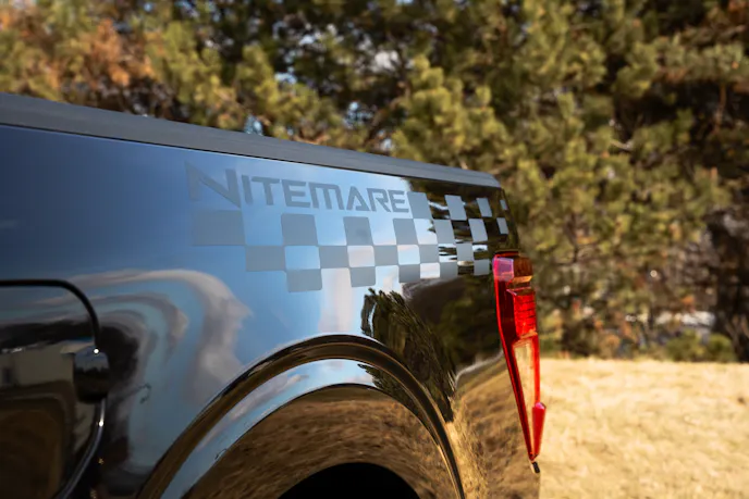 Supporting that grip is a wheel-and-tire package that fills the wells and does its part when the load transfers. The Nitemare rides on 22-inch gloss black wheels wrapped in 305/40R22 General Tire G-MAX AS-07 rubber. That’s a wide footprint for a truck, and it shows up in both lateral stability and braking confidence. Speaking of which, upgraded performance brakes with slotted rotors help bring everything back down from speed with more authority than the stock setup.