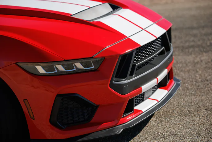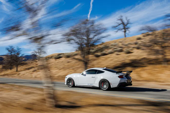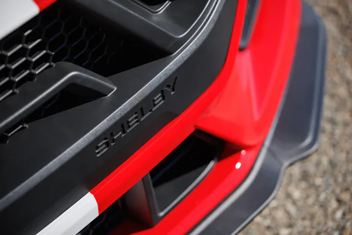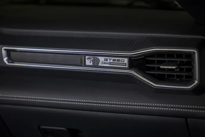 Available with an automatic or manual transmission, the 2025 Shelby GT350 plants the power with the help of suspension enhancements, including upgraded springs and sway bars that lower its ride height and rein in body roll. A Borla cat-back exhaust lets it breathe and sound more muscular in the process. It also includes a litany of aerodynamic and aesthetic upgrades (see sidebar).