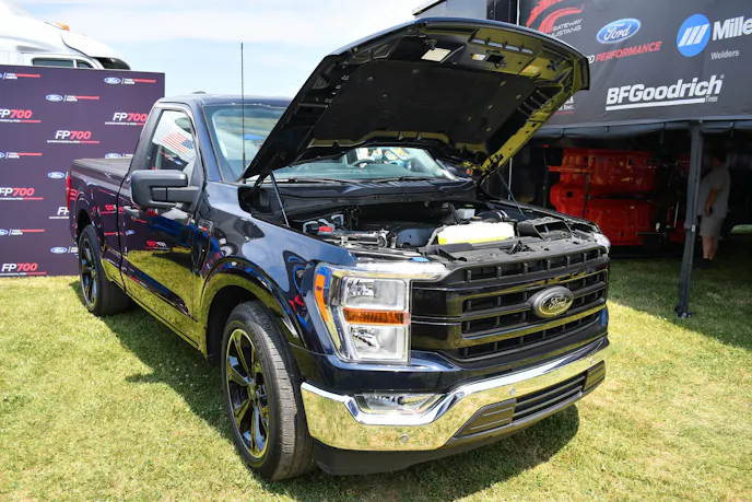 Amidst the tents of Ford Performance and Ford Motor Company at the Carlisle Ford Nationals, a pair of Ford Performance FP700-equipped F-150s caught my attention. One truck offered an up-close look at the FP700 Black Edition while the other featured the FP700 Bronze Edition. The blue crew-cab looked familiar from the SEMA show, but it was the black single-cab that quickly grabbed my attention. Despite being married and having four kids, I can’t help but love the aesthetics of a single-cab F-150.