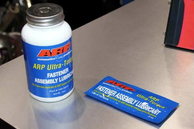 You may also have noticed another interesting new addition in that flexplate bolt kit. ARP’s Ultra-Torque fastener assembly lubricant is a huge step ahead, specifically designed to reduce tension pre-load “scatter” and eliminate the need to cycle high performance engine fasteners before final installation. Unlike engine oil or moly-based lubes, Ultra-Torque hits 95%-100% of the recommended pre-load on the first pull, and maintains that pre-load within 5% on subsequent cycles.