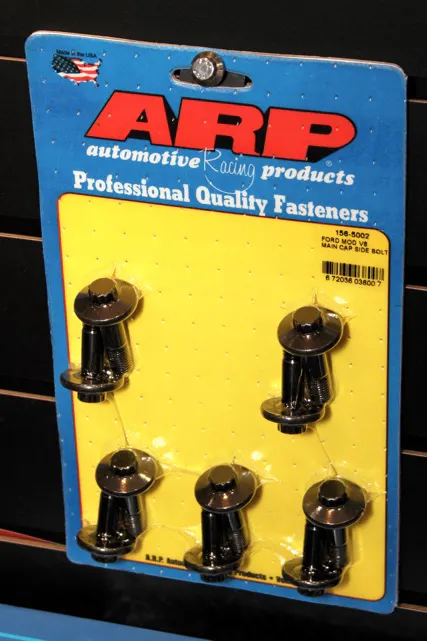 Case in point are these new part numbers we came across at the SEMA show – though the Ford Modular V8 has been around since the mid-90’s, up until now if you wanted to replace the factory main cap side bolts with ARP fasteners, there wasn’t a ready-made option. The new side bolt kits, which are available for early and late aluminum and cast iron blocks in both 2- and 4-bolt main configurations, incorporate a broad head as an integral part of the bolt, rather than a separate washer.