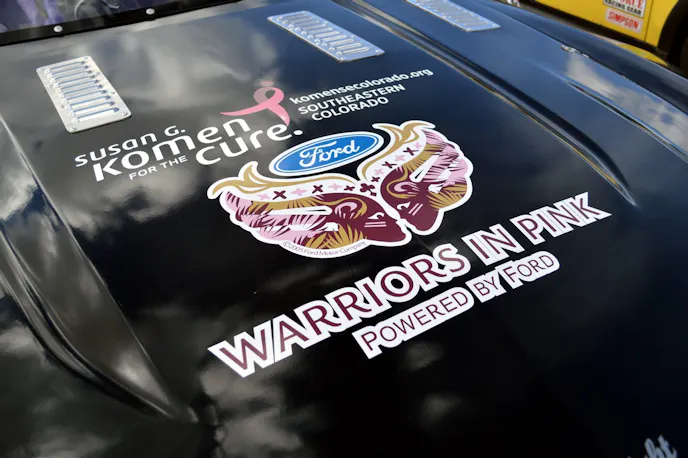 On the hood of the car, Schmidt flies the Ford Warriors in Pink banner, as well as the Susan G. Komen banner- both near and dear causes to Schmidt and his family, showing his long-time support of the fight against breast cancer. Schmidt is so supportive, in fact, that both of these logos were put on the car without a sponsorship or any money exchanged for publicity. Racing across the car’s grille is an American flag-clad running Mustang.