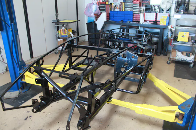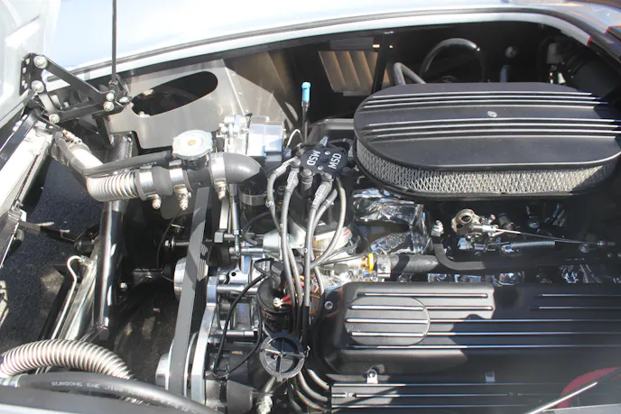 Russ and father Jim improved the frame; dropped in a blueprinted 306 with a Tremec five-speed manual; added classic gauges; shot it in silver with black and red stripes and draped it all in high-grade leather.