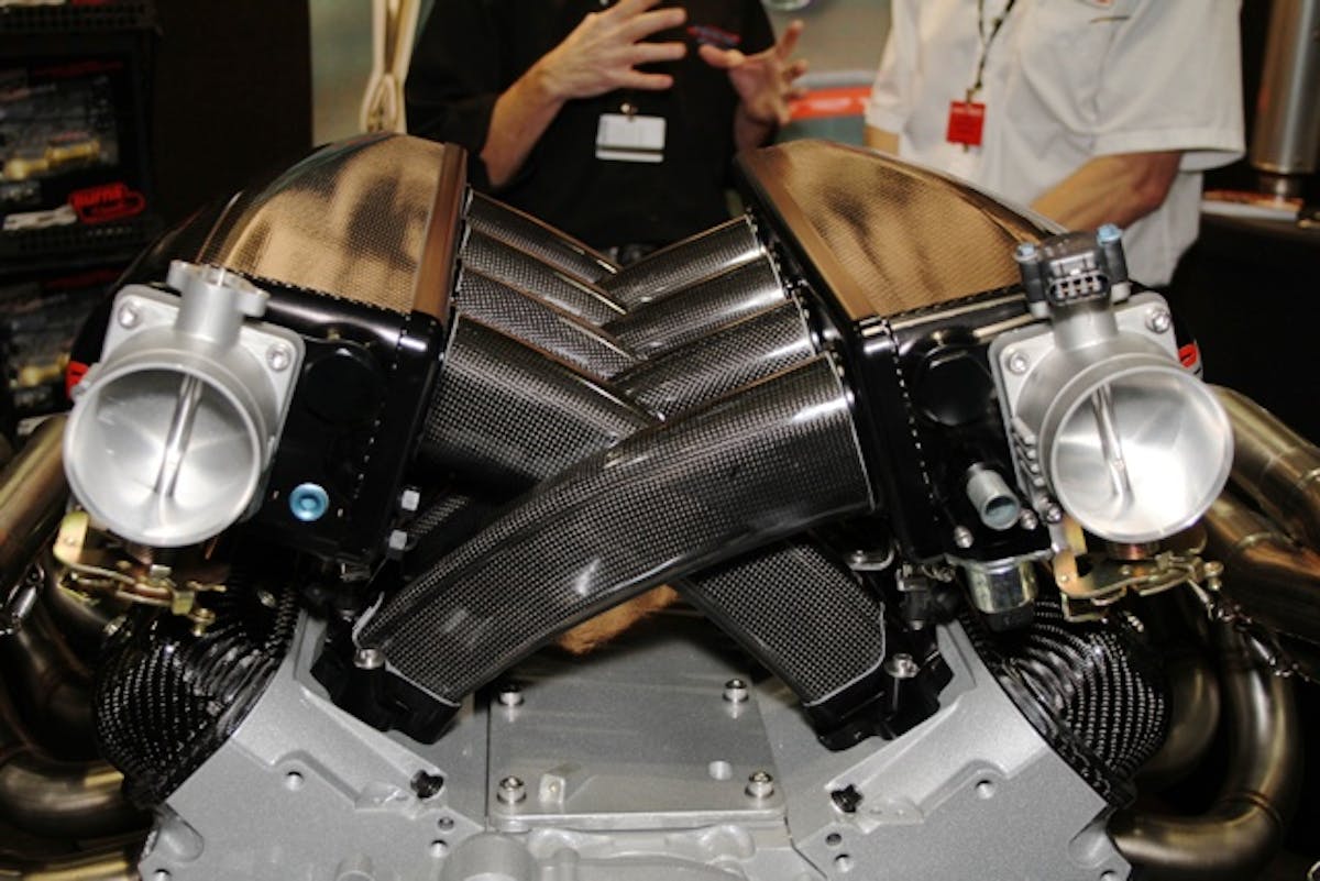 Of course, we can’t mention Burns Stainless’ booth at PRI without talking about the LS7 on display there. Wearing (of course) a Burns Stainless exhaust set up for sand rail use, it was topped by an incredible carbon-fiber cross ram dual plenum intake manifold.