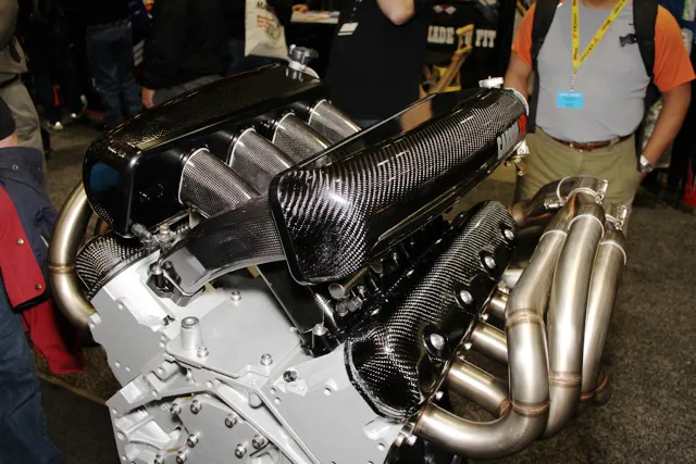 Of course, we can’t mention Burns Stainless’ booth at PRI without talking about the LS7 on display there. Wearing (of course) a Burns Stainless exhaust set up for sand rail use, it was topped by an incredible carbon-fiber cross ram dual plenum intake manifold.