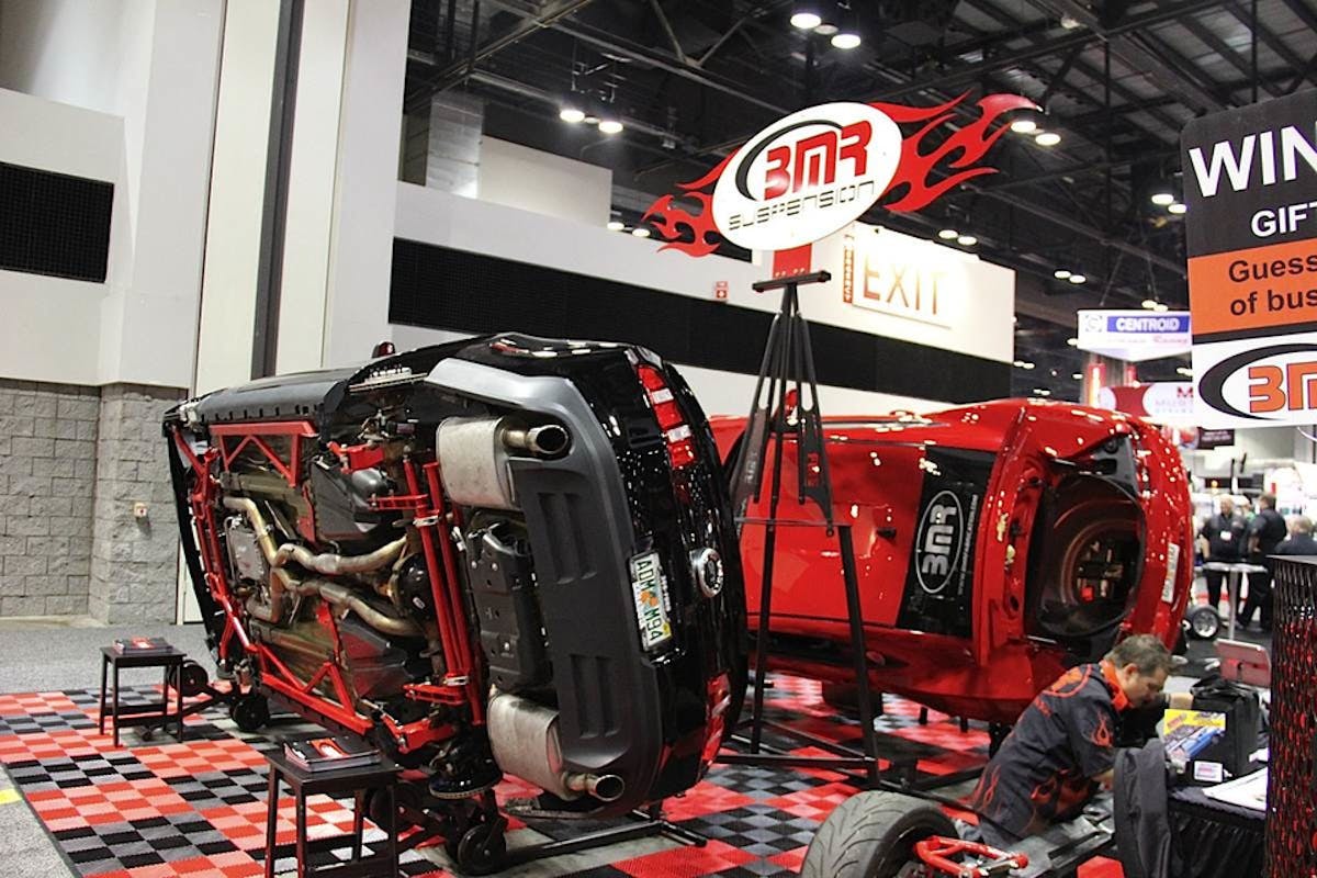 What better way to show off your full-tilt, bolt-on suspension products than by tilting each BMR project vehicle on it side? It was awesome to say the least and were ecstatic over the the amount of parts and components bolted to the underside. What’s new for this year? Well, for starters BMR is was showcasing an all-new adjustable lower control arm setup for ’10-11 Camaros.